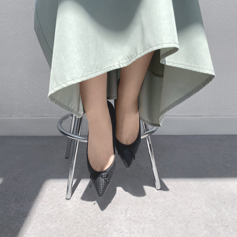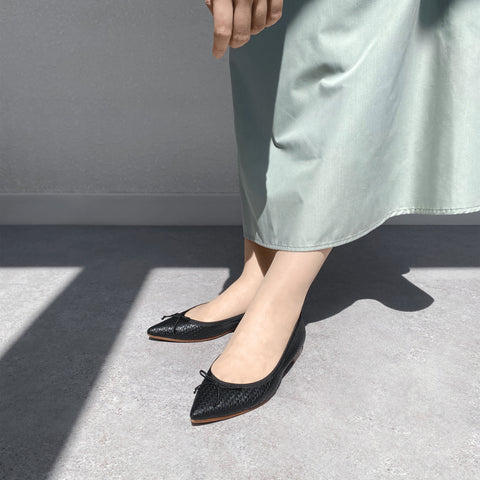 Classic ballet shoes with a mesh-like embossed material for an elegant and casual look. A pair of shoes that adult women would love to wear with their pointed and shallow cut. We have prepared a variety of colors that will make you want to have multiple pairs because you want to wear them every day.