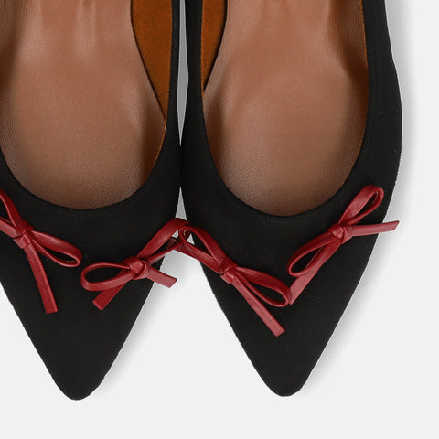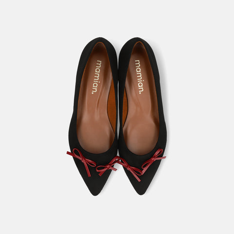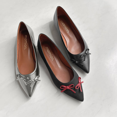 ランダムに配置されたツインリボンがおしゃれなフラットシューズ。ポインテッドトゥが足を美しく見せ、フラットヒールで快適さも兼ね備えています。